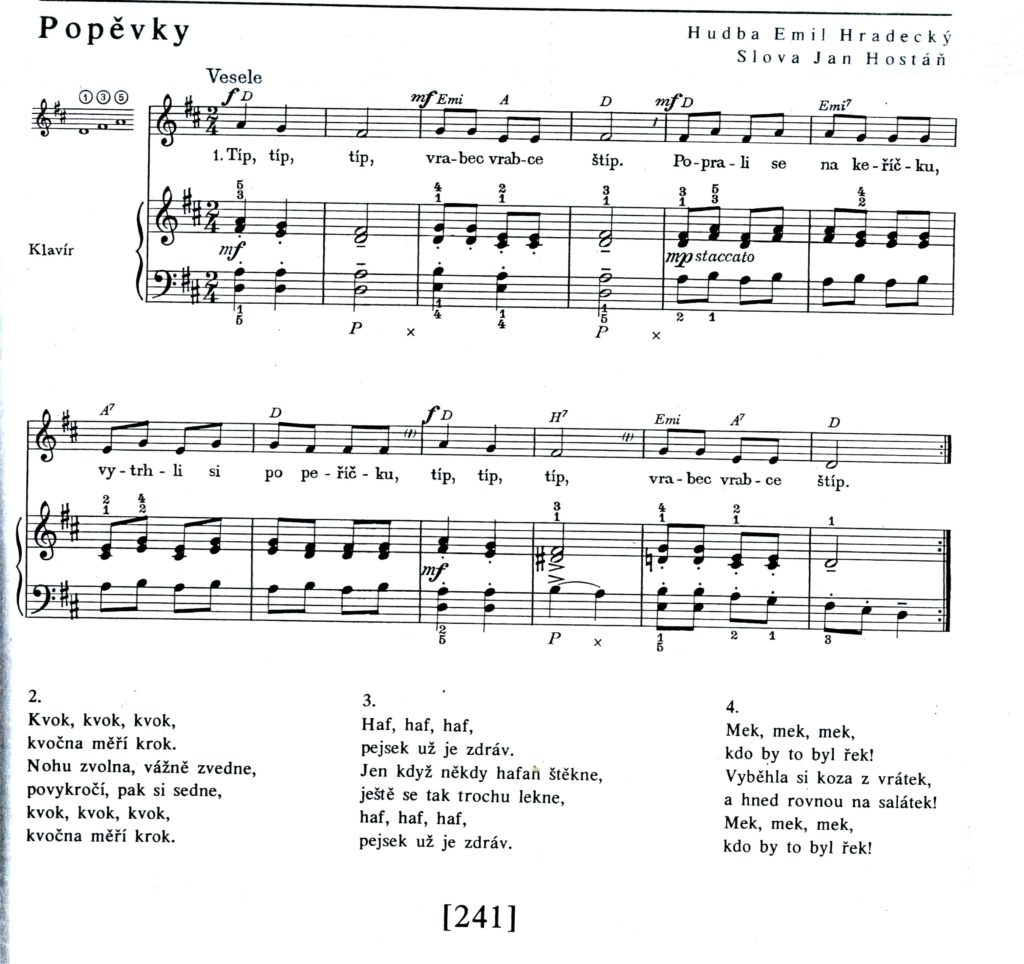 | 5. Mů, mů, mů, kráva chce domů. Netěší ji tráva sladká, vzpomněla si na telátka, mů, mů, mů, kráva chce domů. | 6. Cvrk, cvrk, cvrk, cvrčka bolí krk. Cvrčí cvrček, cvrčí cvrček, že ho bolí celý krček, cvrk, cvrk, cvrk, cvrčka bolí krk. |